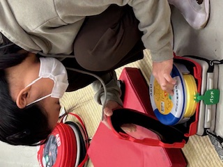 竹棒を使って毛布を巻いて応急で担架を作ることも教わり実践してみました。