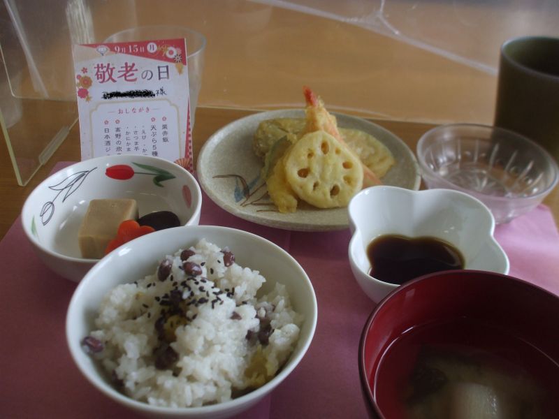 お昼ごはんは栗赤飯、天ぷら5種盛り合わせ(えび、かぼちゃ、れんこん、さつま芋、カニカマ)、高野の炊き合わせ、お味噌汁に日本酒ジュレでした。日本酒ジュレはお酒の香りがして、味はさっぱりでおいしかったそうです!!