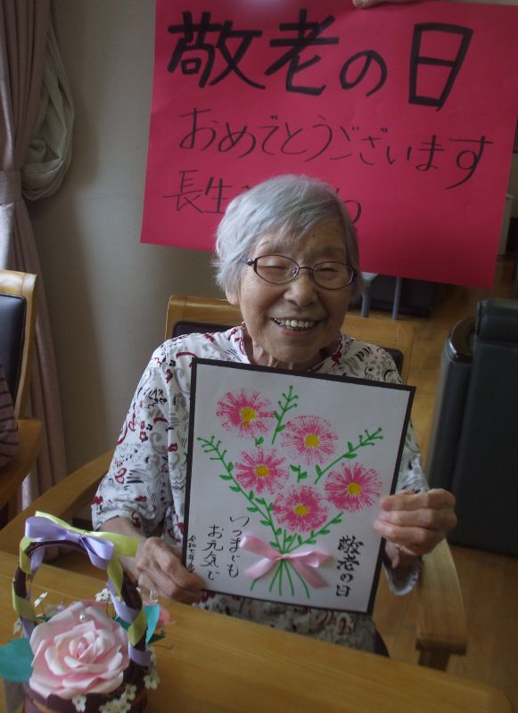 つばきユニットでは9月がお誕生日の方もいて、盛大にお祝いしていましたよ。皆さんからの寄せ書きメッセージをプレゼント(^^♪ ちなみに卒寿でした。