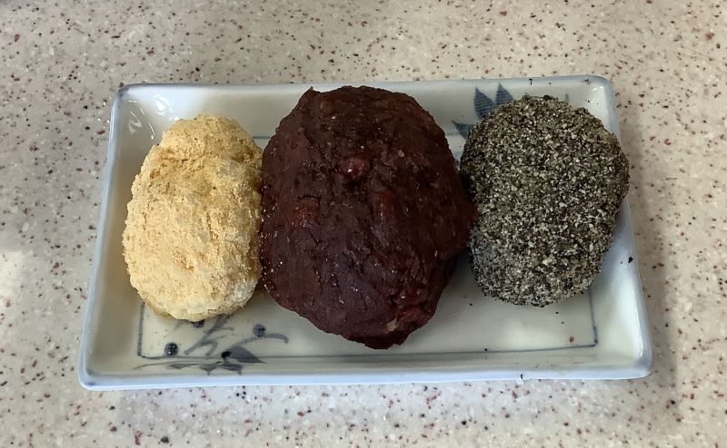 つぶしたものを丸めて、3色(あんこ、きな粉、黒ゴマ)それぞれまぶしていきます。