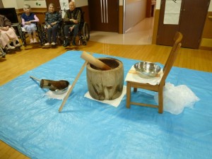 準備は万端。まずは職員さんがお餅をついて、少しお餅になってきたところで仕上げを入居者様にお願いしました。