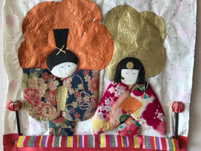 和紙と着物生地を使って貼り絵に仕上げたお雛様と