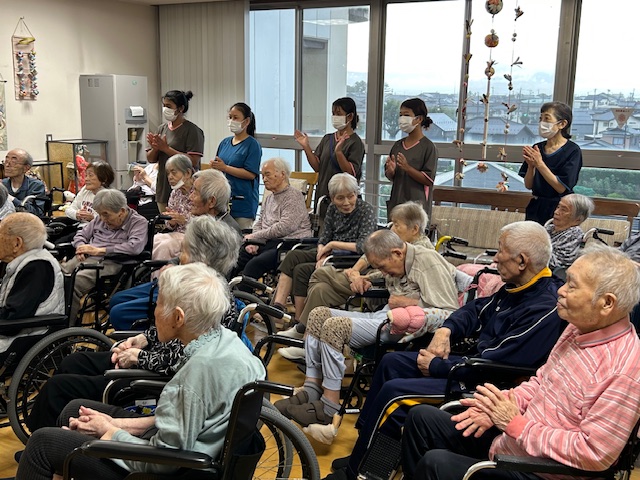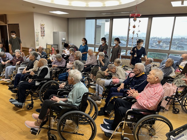 この日『敬老のお祝い』で入居者の皆様が集まって懐かしい歌を歌ったりクイズを楽しんだりされていました。