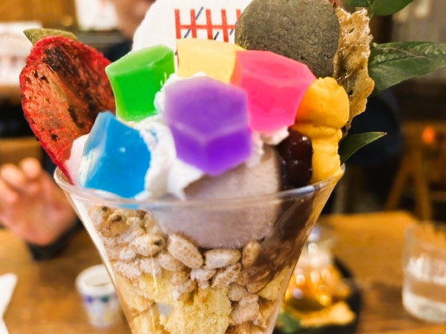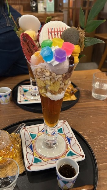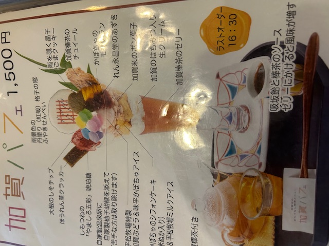 びっしりといろんなものでいっぱいな大きなパフェと加賀棒茶が添えられています♡