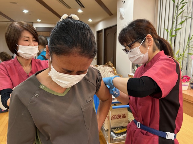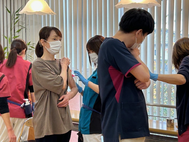 注射は嫌だ~という人はたくさんいますが、入居者様に感染を持ち込まないよう、もしも自分がかかっても軽く済むよう、よほどのことがない限りは受けて頂いています。