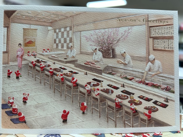 もう一枚は、回らないお寿司屋さん!!豪華なお食事を楽しむサンタさん達。
