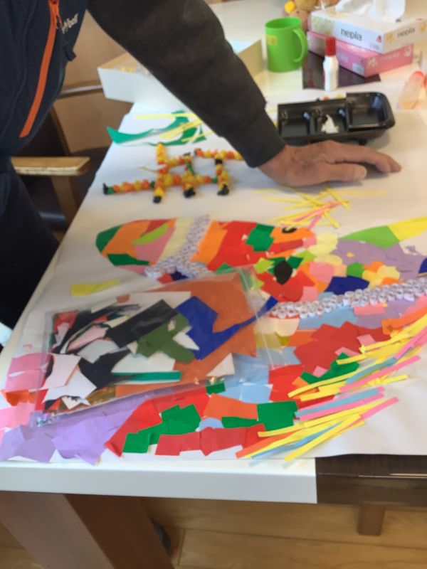 「今、まだ途中やわ。」とT様。“年”と見えますが・・・。折り紙を手でちぎって貼っていました。手前のカラフルな絵は何でしょうか(?_?)出来上がりましたらまた紹介させてもらいます。出来上がりが楽しみです(^^)