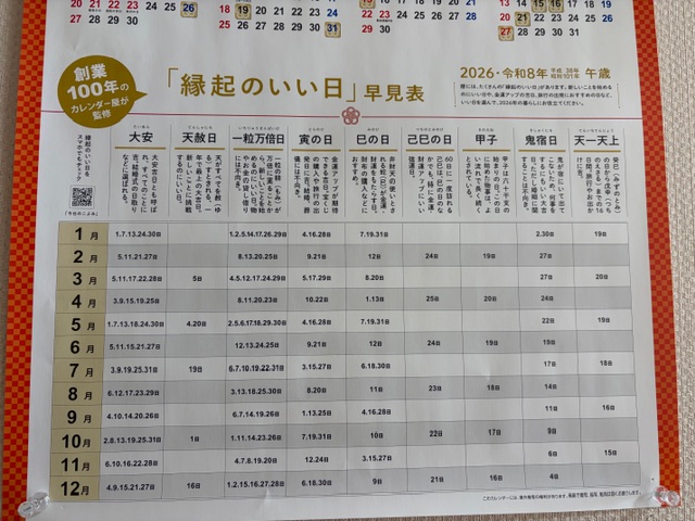 キラッと篤寿苑の3階を歩いていたら、職員紹介写真のパネルの傍にカレンダーが貼ってありました。そこに『縁起のいい日』早見表が掲載されていました。
