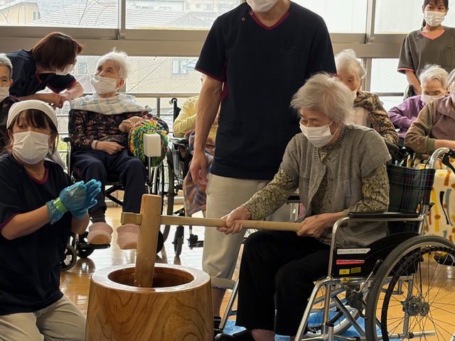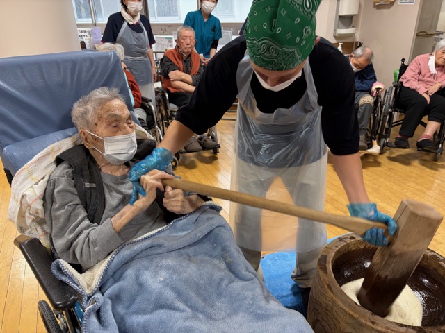 御年103歳(もうすぐ104歳)の入居者様も杵を持ったら目がパチッと!