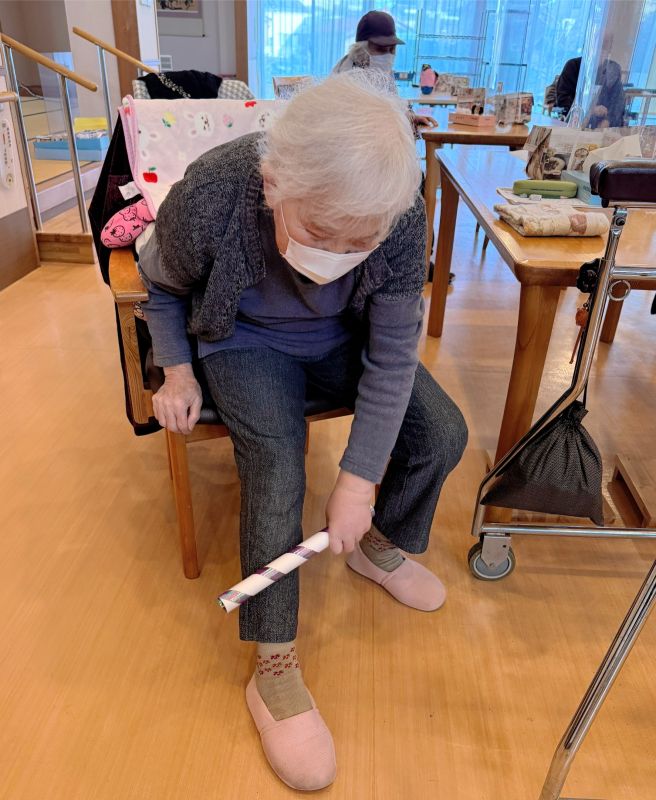 美川デイサービスでも機能訓練の時間に膝関節を伸ばす
