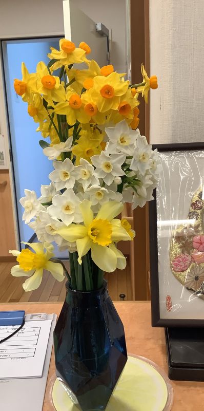 キラッと白山玄関には職員の家で咲いた3色の水仙を飾りました。玄関は春の香りいっぱいです。