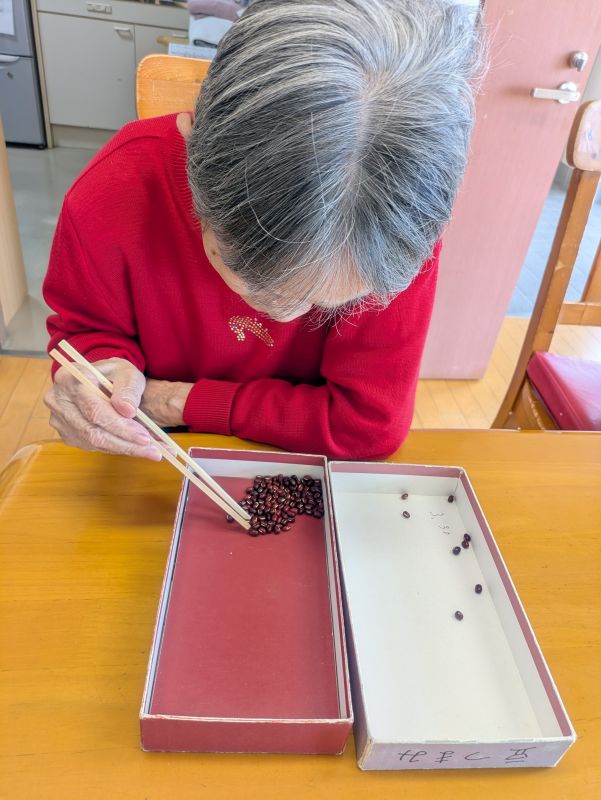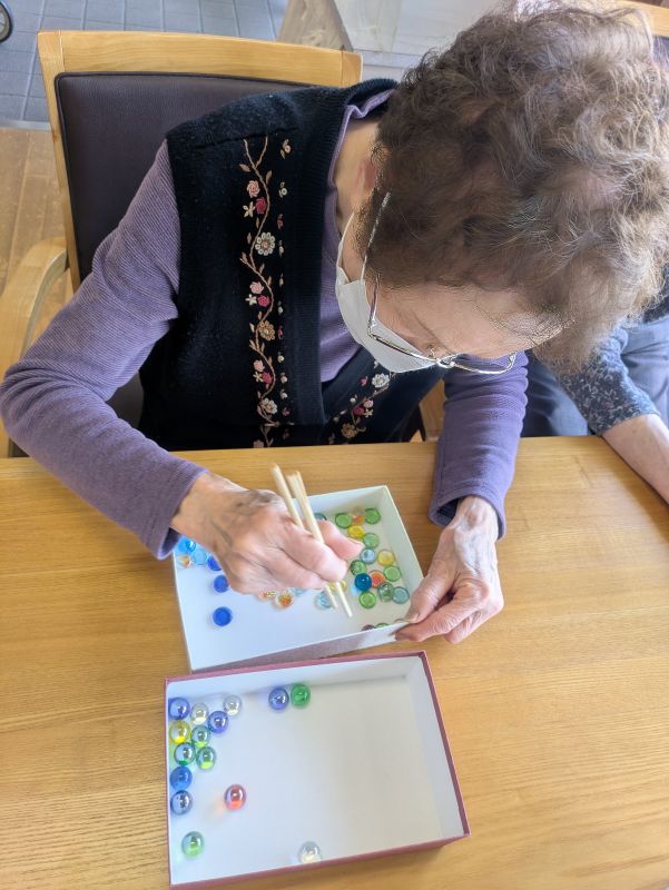 こちらの方は塗り箸で挑戦中。「これくらいなんでもないわ」と余裕で次々と移動させてましたよ(*^。^*)
