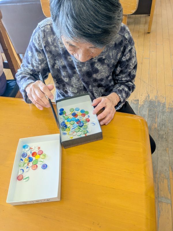 そしてこちらは、ビー玉とおはじきを箸でつまんで隣の箱へ・・・。とっても上手で、ビー玉も素早く移動させてました。私もチャレンジしましたが、ビー玉はつまめませんでした( ;∀;) 「そんなお箸の持ち方じゃだめよ~」とのお言葉もいただきました(笑)