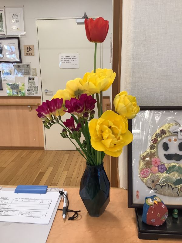 お花って時期がわかるんですかね~。我が家のチューリップが満開になり切り花にして持ってきました。ケアの玄関に飾ってもらいましたよ~(*^-^*)