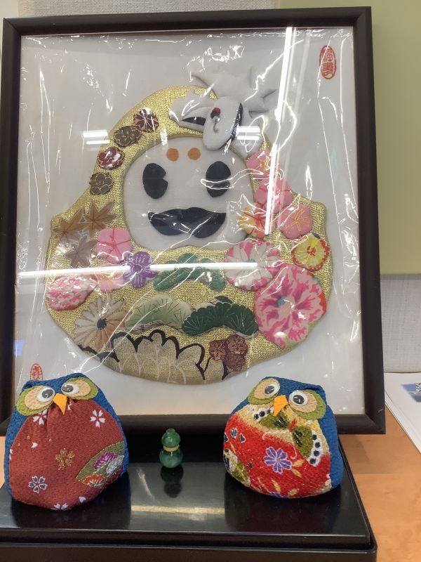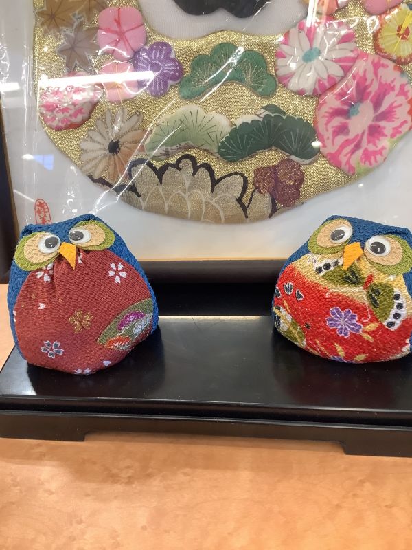 端切れを使って作られたそうです。縁起物の”ふくろう”かわいいですよね~(^^)で百万さんと一緒に!