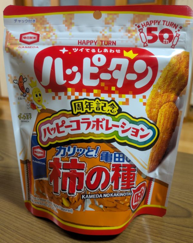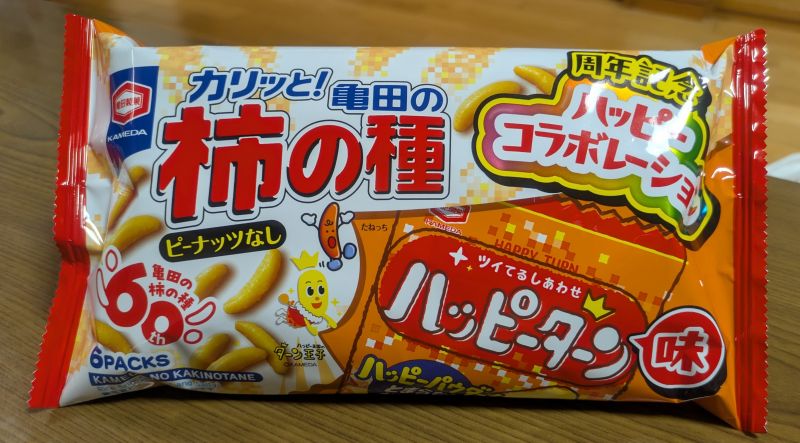 亀田の柿の種とハッピーターンのコラボ商品です。お店に並んでいるのをみて、一度はスルーしたのですが、やっぱり気になって買ってしまいました(^-^)